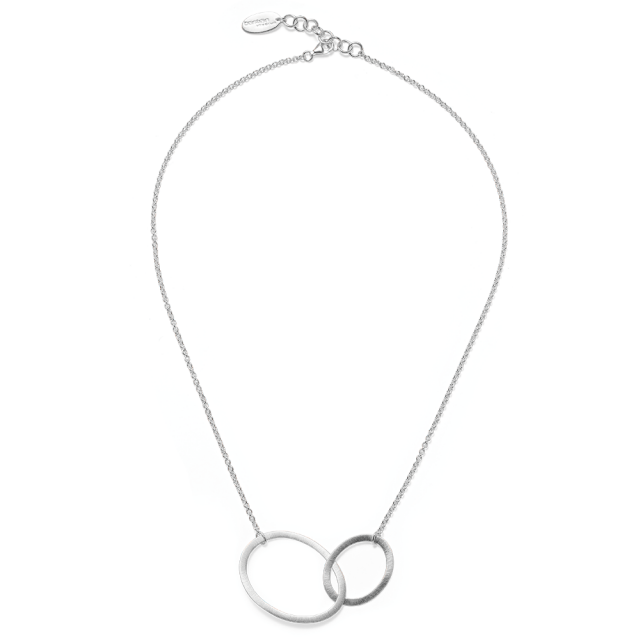 Moderne Sterlingsilber- Halskette aus zwei unterschiedlich großen, ineinander verschlungenen Schmuckelementen aus der Feder der bekannten Designerin Antje Liebscher. Insbesondere in Kombination mit dem dazugehörigen Ohrschmuck ist dieser Anhänger, der inkl. der daran befindlichen Rundankerkette geliefert wird, ein wahrer Hingucker und Schmuck-Allrounder.