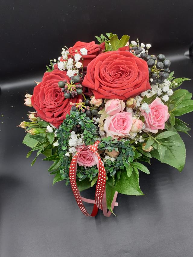 Strauss gebunden mit drei roten Rosen, Polyantarosen in pink/rosa, Schleierkraut und Herz mit Band geschmückt
