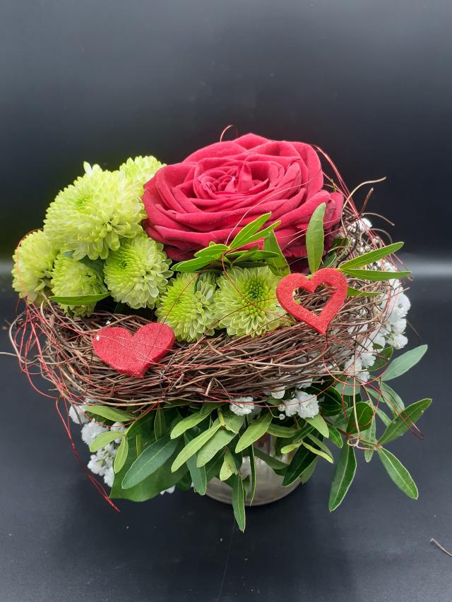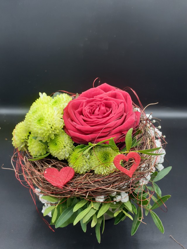 Strauss gebunden mit einer roten Rose, Chrysantheme, Schleierkraut, einen Twickykranz und Schmuckdraht mit Herzle