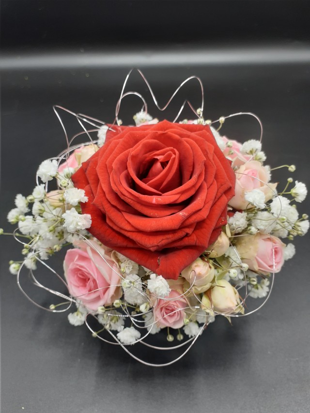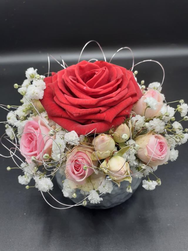 Silbertopf, gesteckt mit einer roten Rose, umspielt mit verzweigten pink-rose Rösle und Schleierkraut.