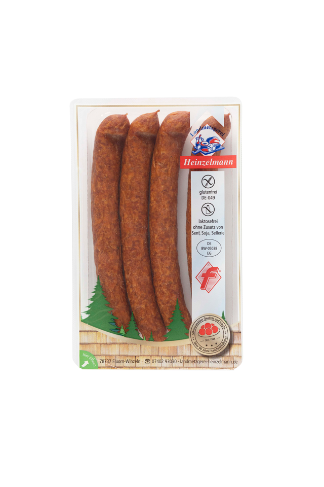 Länger haltbar und auch kurzzeitig ohne Kühlung. Herzhafter Genuss als Handvesper kalt und warm, besonders kräftig. Bei Wanderungen, im Schwimmbad oder als Vesperwurst. Beim Erhitzen auf eine schonende Erwärmung achten. Schmeckt zu allen herzhaften Kohl- und Gemüsegerichten. Deftiges Räucheraroma.
