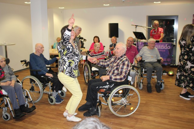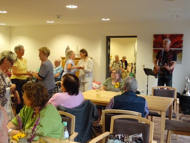 Im Anschluss fanden sich alle im Café Paula zusammen, wo sie vom Duo „San Fernando“ mit dem Lied „der Mai ist gekommen“ begrüßt wurden. Nachdem alle mit Erdbeerbowle und Knabbersachen eingedeckt waren, wurde langsam schon das ein oder anderen Tanzbein geschwungen. Das Duo spielte unermüdlich einen Song nach dem anderen mit nur kurzen Pausen, was dazu führte, dass die Zeit von allen erfolgreich vergessen wurde. Irgendwann wurden die Tische zur Seite gestellt, sodass die Tanzfläche größer wurde und so kam es, dass die meisten Bewohnerinnen und Bewohner erst um halb 12 zu Bett gingen.
