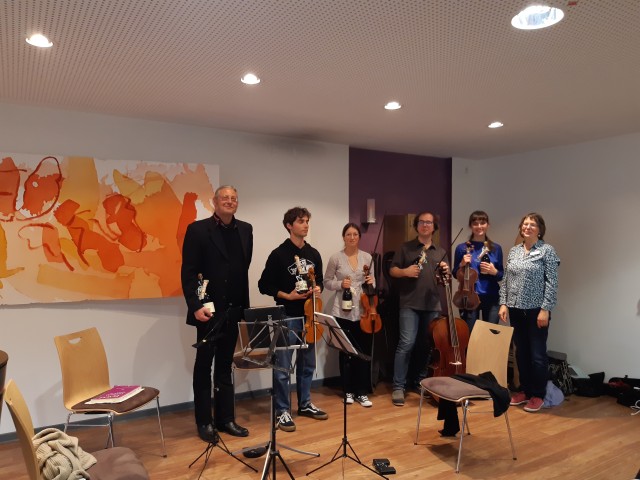 Wir waren fasziniert und auf die Musik focussiert. In unserer Kapelle hätte man eine Stecknadel fallen hören. Als Zugabe und zum Abschluss spielte das Quartett noch einen Choral von Johann Sebastian Bach für uns.